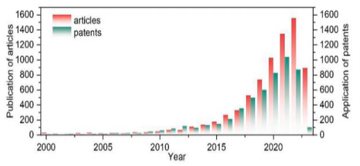 过去二十年中,锂固态电解质和固态锂电池的相关研究进展可大致分为三个阶段。2000年至2010年,年度发表的文章和专利申请数量保持在较低水平。2011年至2015年,文献数量稳步增长,标志着该领域的逐步发展。自2015年以来,文章和专利数量经历了爆炸性增长,并且至今仍在迅速增加。显然,固态电池技术已成为学术界和工业界的热门概念,吸引了全球科学家和工程师的广泛关注。
